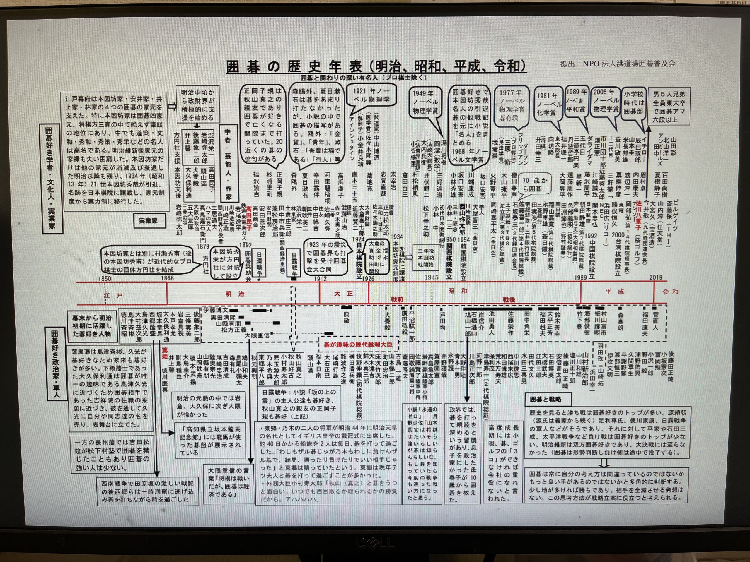 その中で「囲碁歴史年表」もあります。棋士の水間先生から推薦されて初めて拝見しましたが、とても素晴らしい年表です。囲碁が昔から愛されていること、たくさんの方々が楽しんでいたことがよく分かる2枚で出来ている資料です。水間先生や制作してくださった方の想いを込めて精一杯広めて行きます。