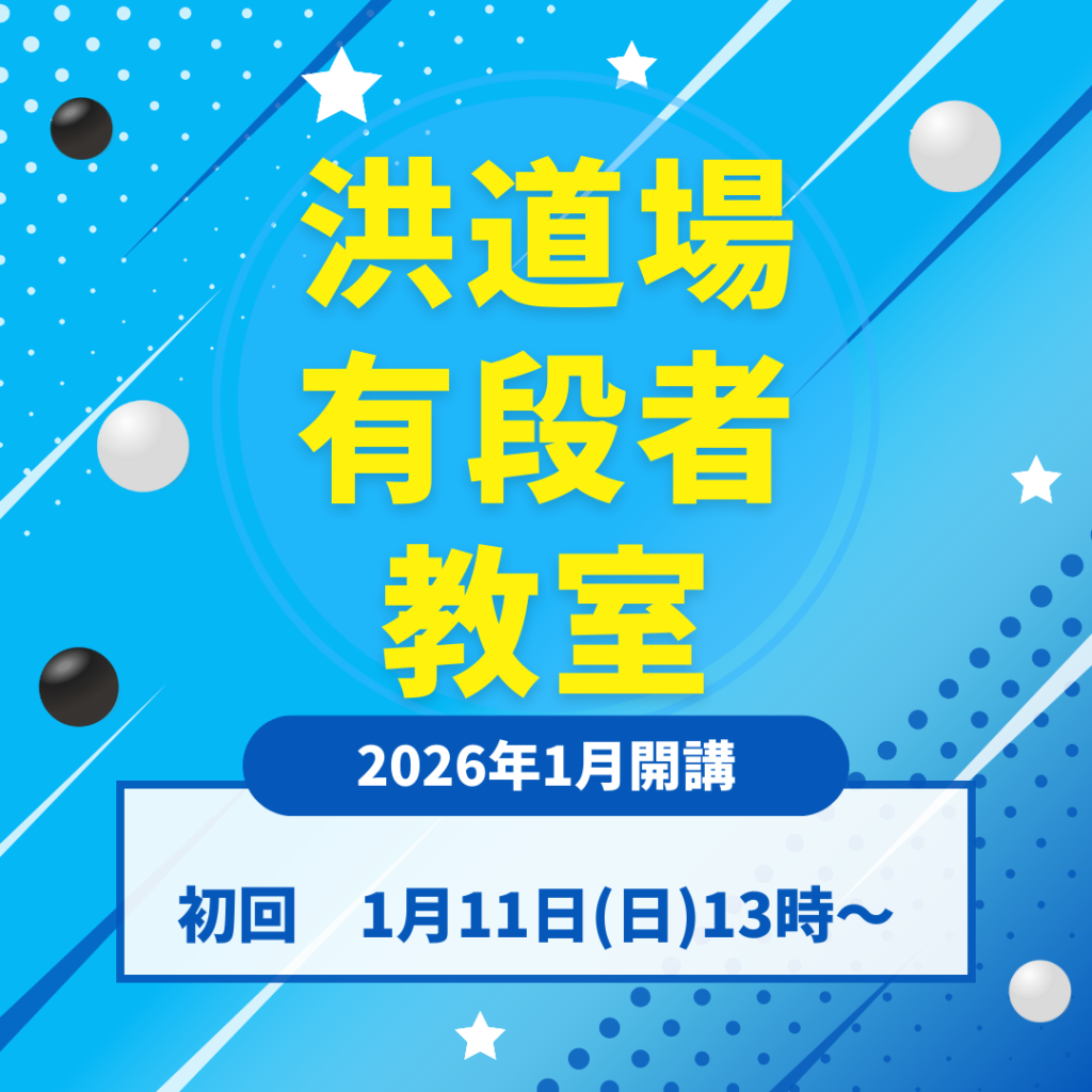 1. 教室概要 ワンランク上を目指す有段者、上級者のための囲碁教室を開講いたします。 局後の検討を丁寧に行い、洪道場の棋士、師範が皆様の上達をサポートします。 2. 開催日程 第二・第四週の日曜日 3ヶ月・全6回の1クール制 日程:2026年1月11日(日)、2...